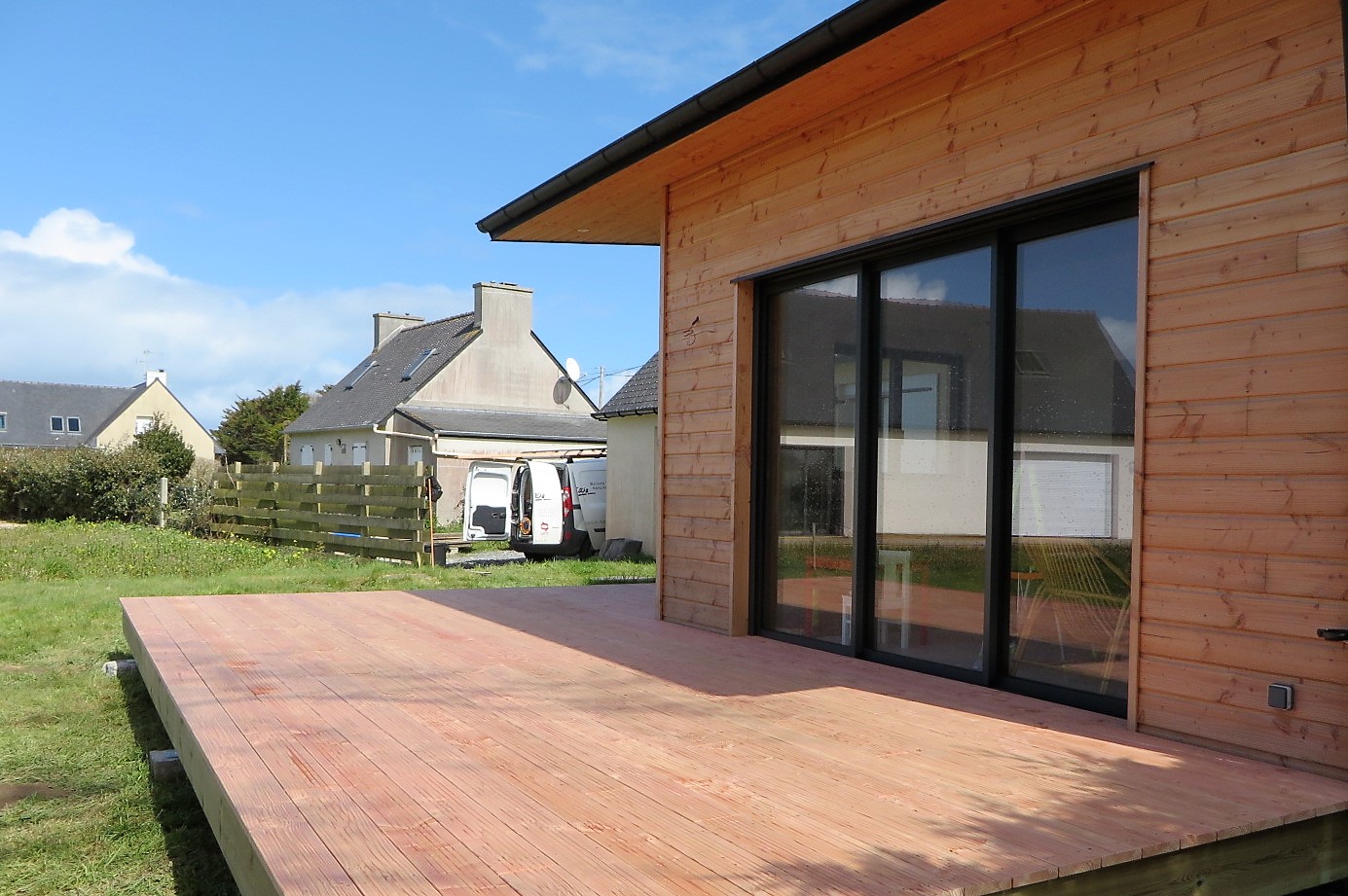 Le projet d’extension sur la commune de Landeda, consistai à agrandir l’existant de façon à créer une pièce de vie supplémentaire en favorisant l’utilisation de matériaux respectueux de l’environnement. Nous l’avons conçue en ossature bois douglas de section 145/45 et en charpente en douglas de section 200/80. L’entreprise de maçonnerie Pierre Garnier a réalisé la dalle en béton sur laquelle repose l’ouvrage ainsi que la chape lisse intérieure. La couverture en mono-pente zinc anthracite a été posée par l’entreprise de couverture l’Atelier du couvreur située à Plouzané. Les murs et la toiture sont isolés par l’extérieur en fibre de bois de 35mm. L’isolation intérieure est en laine de bois de 140mm recouverte d’un frein vapeur qui permet de garantir l’étanchéité à l’air et la bonne régulation de la vapeur d’eau. Le bardage est en douglas, posé horizontalement. Les clients ont opté pour ce bardage de classe 3 non traité chimiquement et qui ne demande par d’entretien, il grise naturellement dans le temps. Les menuiseries extérieures sont en aluminium avec coffres de volets roulants intégrés pour éviter les ponts thermiques. Concernant l’aménagement intérieur, le doublage est en fermacell (plaque de gypse et cellulose) et le sol en parquet stratifié. Nous avons pris le parti de ne pas faire de faux plafond et de suivre la pente du toit pour gagner en volume et en luminosité.