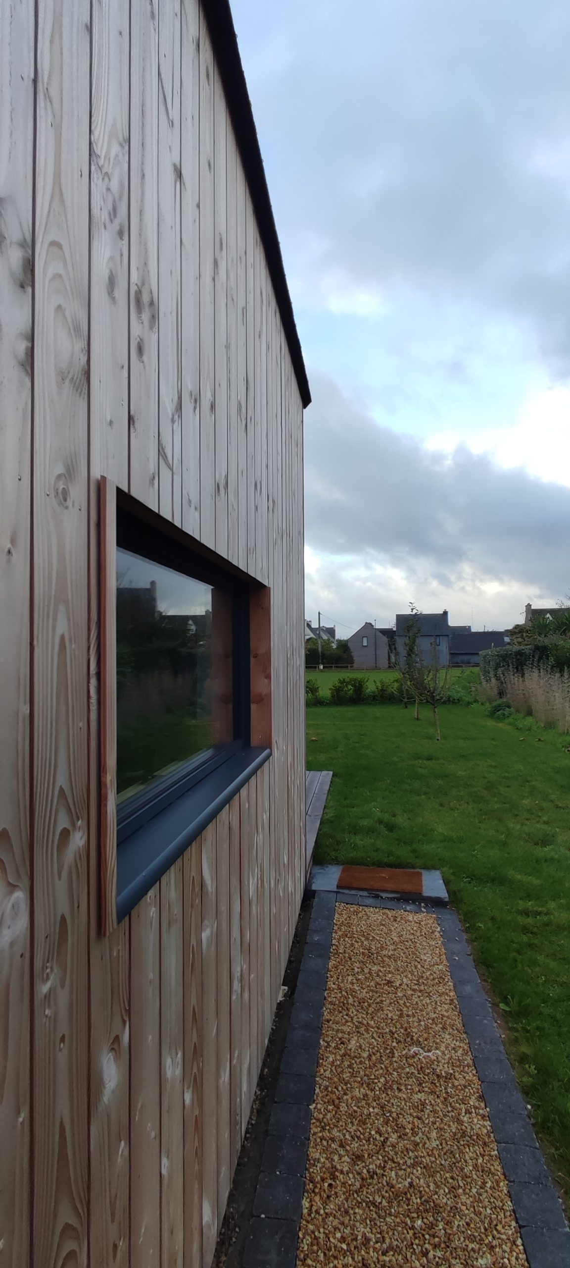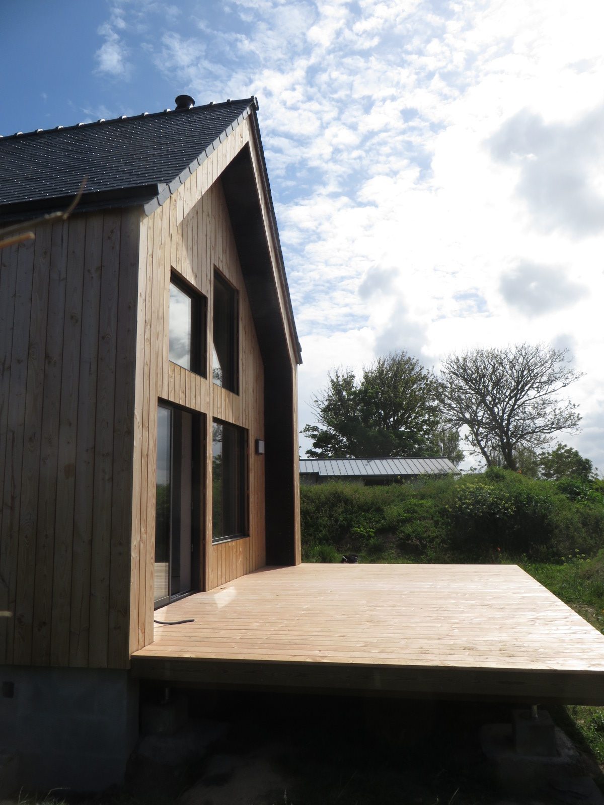 Construction d’une petite maison en bois composée de deux volumes distincts. Le volume principal, d’une superficie de 47m², abrite l’espace de vie, tandis que le volume secondaire, de 7m², est dédié au garage à vélos. L’ensemble du toit est recouvert d’ardoises naturelles en provenance d’Espagne.
